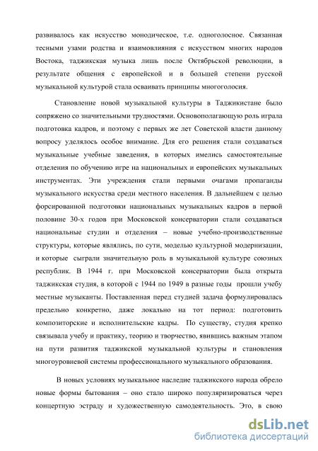 4См.Таджикова З. Песенная культура таджиков (по материалам Зеравшанских искусствоведческих экспедиций 1958-1961 гг.). Дисс… кандидата искусствоведения. – Л., 1977; Попандопуло Т. Таджикская фортепианная музыка и проблемы ее интерпретации. Дисс…. кандидата искусствоведения. - Л., 1987; Акрамова С. Музыкальное искусство Таджикистана в 20-30-х годах. Дисс… к.и.н. – Душанбе, 1997.
