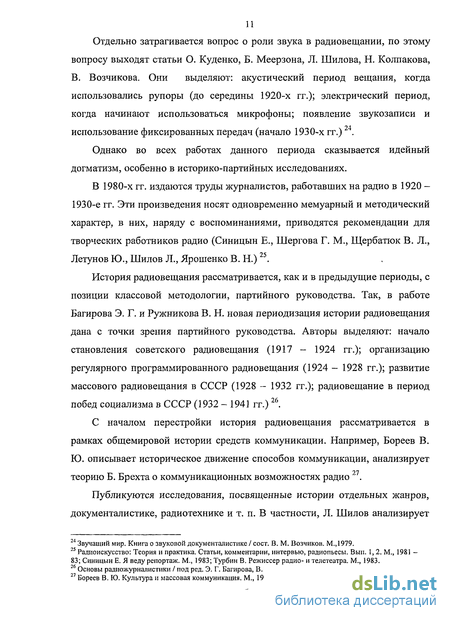 В это время выходит наибольшее количество трудов по истории становления отдельных форм радиовещания. Так, Шилов Л. рассказывает о том, как разыскивались и реставрировались записи голосов Л. Толстого, А. Блока, С. Есенина . Анализируется история жанров радио. Например, Бараневич Ю. Д. рассматривает проблемы их становления, формирования и развития, на основе исторических материалов описывает их композиционно-стилистические особенности, процессы взаимовлияния и взаимообогащения жанров 23.