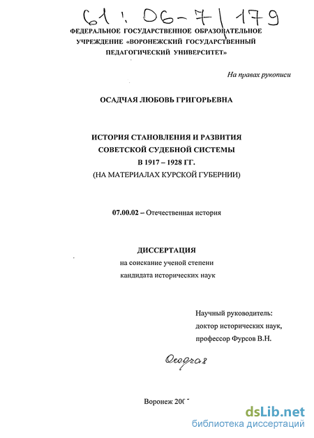 Предметом исследования является формирование, структура судебной системы Курской губернии, а также ее кадровый состав, материальное обеспечение и основные направления деятельности судебных органов в 1917-1928 гг.
