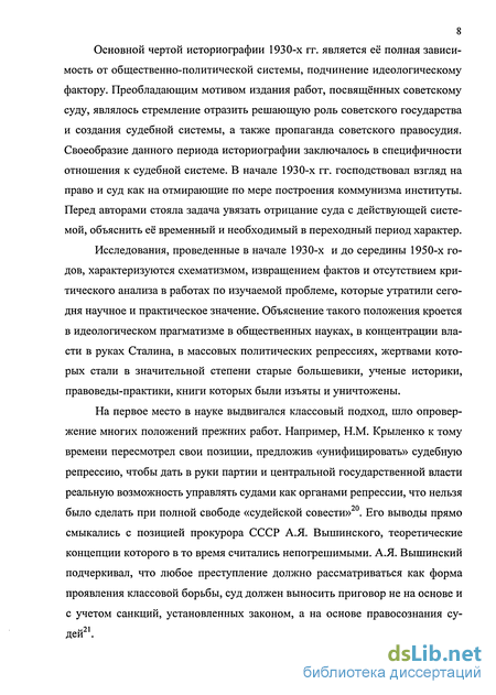 8 Основной чертой историографии 1930-х гг. является её полная зависимость от общественно-политической системы, подчинение идеологическому фактору. Преобладающим мотивом издания работ, посвященных советскому суду, являлось стремление отразить решающую роль советского государства и создания судебной системы, а также пропаганда советского правосудия. Своеобразие данного периода историографии заключалось в специфичности отношения к судебной системе. В начале 1930-х гг. господствовал взгляд на право и суд как на отмирающие по мере построения коммунизма институты. Перед авторами стояла задача увязать отрицание суда с действующей системой, объяснить её временный и необходимый в переходный период характер. Исследования, проведенные в начале 1930-х и до середины 1950-х годов, характеризуются схематизмом, извращением фактов и отсутствием критического анализа в работах по изучаемой проблеме, которые утратили сегодня научное и практическое значение. Объяснение такого положения кроется в идеологическом прагматизме в общественных науках, в концентрации власти в руках Сталина, в массовых политических репрессиях, жертвами которых стали в значительной степени старые большевики, ученые историки, правоведы-практики, книги которых были изъяты и уничтожены.