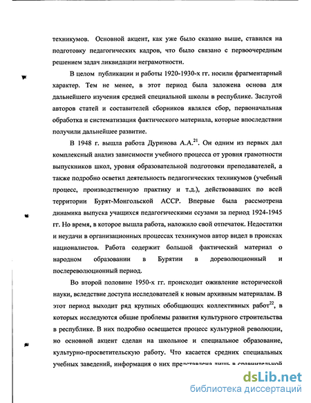 В 1948 г. вышла работа Дуринова А.А.21. Он одним из первых дал комплексный анализ зависимости учебного процесса от уровня грамотности выпускников школ, уровня образовательной подготовки преподавателей, а также подробно осветил деятельность педагогических техникумов (учебный процесс, производственную практику и т.д.), действовавших по всей территории Бурят-Монгольской АССР. Впервые была рассмотрена динамика выпуска учащихся педагогическими ссузами за период 1924-1945 гг. Но время, в которое вышла работа, наложило свой отпечаток. Недостатки и неудачи в организационных процессах техникумов автор видел в происках националистов. Работа содержит большой фактический материал о народном образовании в Бурятии в дореволюционный и послереволюционный период.