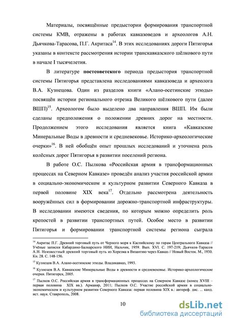 Основы транспортной системы на КМВ начали формироваться в глубокой древности. Эта территория, расположившаяся в предгорной зоне Центрального Предкавказья, всегда находилась на стыке проживания разных народов и культур. Благоприятные климатические и ландшафтные условия способствовали появлению в этом регионе многочисленных и многолюдных поселений, находившихся в постоянных контактах между собой. Через транскавказские пути был налажен торговый и культурный обмен с отдалёнными от этого места территориями. Это способствовало устройству здесь первых дорог. Вопросы функционирования древних дорог на Пятигорье наиболее подробно рассматривались в работах В.А. Кузнецова, А.А. Иерусалимской, А.Н. Дьячкова-Тарасова и П.Г. Акритаса. На основе собственных археологических исследований и анализа найденных другими археологами древних предметов ими были определены направления одного из ответвлений Великого шёлкового пути (далее ВШП). Начало функционирования этой дороги специалисты относят ко II-I вв. до н.э. На территории городищ и поселений до сих пор находят вещи, которые могли появиться здесь только при условии наличия транспортной связи с другими регионами54.