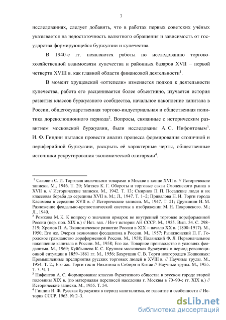 В период хрущевской оттепели усиливается интерес исследователей к дореволюционному этапу истории России. Проблематика научных изысканий касается вопросов развития классов буржуазного сообщества, начального накопления капитала в стране, общегосударственной торгово-индустриальной и общественной политики дореволюционного периода. При этом более объективной становится оценка деятельности купечества1. На данном этапе А.С. Нифонтов исследует вопросы, связанные с историческим развитием московской буржуазии2, И.Ф. Гиндин проводит анализ процесса формирования столичной и периферийной буржуазии, пытается раскрыть её характерные черты, общественные источники рекрутирования экономической олигархии3.