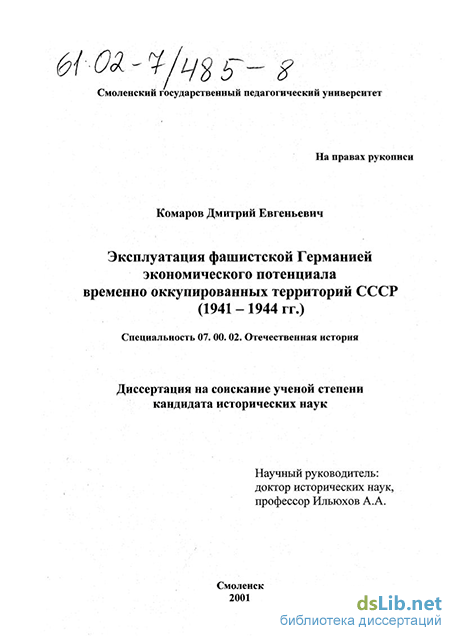 Комаров Дмитрий Евгеньевич. Эксплуатация фашистской Германией экономического потенциала временно оккупированных территорий СССР, 1941-1944 гг. : диссертация ... кандидата исторических наук : 07.00.02.- Смоленск, 2001.- 281 с.: ил. РГБ ОД, 61 02-7/485-8