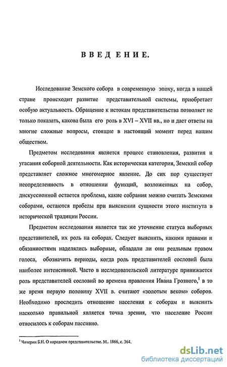 Предметом изучения в рамках данной работы являются Земские соборы. Исследование посвящено изучению эволюции сословного представительства, изменения роли выборных представителей на разных этапах существования соборов, влияния чинов собора на власть при решении важнейших вопросов, уточнению статуса выборных. Хронологические рамки исследования охватывают период со времени проведения московским правительством губной реформы в 30–х гг. XVI в. В это время происходит зарождение сословного представительства на местах. Конечный рубеж отнесен к 1653г, когда произошел созыв последнего Земского собора.