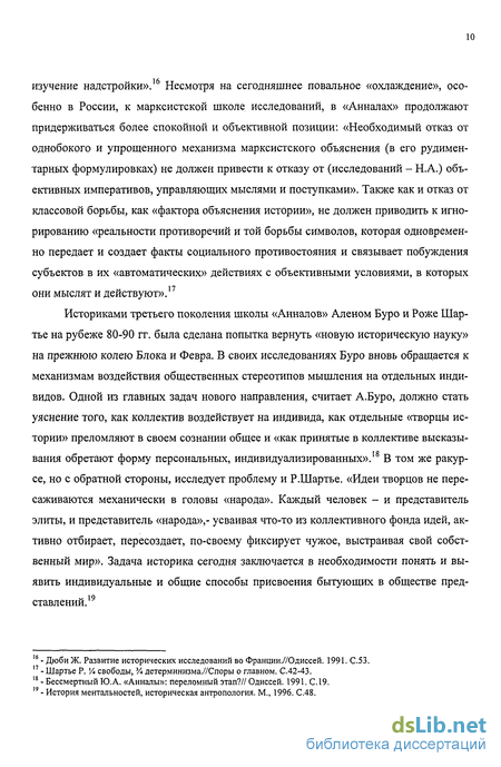Историками третьего поколения школы «Анналов» Аленом Буро и Роже Шар-тье на рубеже 80-90 гг. была сделана попытка вернуть «новую историческую науку» на прежнюю колею Блока и Февра. В своих исследованиях Буро вновь обращается к механизмам воздействия общественных стереотипов мышления на отдельных индивидов. Одной из главных задач нового направления, считает А.Буро, должно стать уяснение того, как коллектив воздействует на индивида, как отдельные «творцы истории» преломляют в своем сознании общее и «как принятые в коллективе высказы-вания обретают форму персональных, индивидуализированных». В том же ракурсе, но с обратной стороны, исследует проблему и Р.Шартье. «Идеи творцов не пересаживаются механически в головы «народа». Каждый человек - и представитель элиты, и представитель «народа»,- усваивая что-то из коллективного фонда идей, активно отбирает, пересоздает, по-своему фиксирует чужое, выстраивая свой собственный мир». Задача историка сегодня заключается в необходимости понять и выявить индивидуальные и общие способы присвоения бытующих в обществе представлений.19