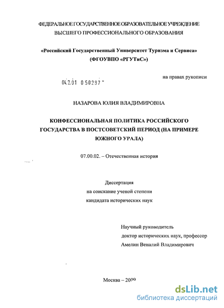 Духовный облик сегодняшней России немыслим без ислама // Ислам в России: традиции и перспективы. -М., 1998; Зорин В.Ю. Механизмы реализации этнической и религиозной политики в Приволжском федеральном округе // Этноконфессиональный диалог: состояние, противоречия: перспективы развития. Матер! межрег. науч.-практ. конф. - Оренбург, 2002 и др. 1 Мозговой С.А. Проблемы свободы совести и вероисповедания в Российской Армии // Свобода совести: новые подходы и новые вызовы. Матер, междунар. конф. - М., 1999. С. 44-52; Мозговой С.А. Вооруженные Силы России и религиозные объединения: состояние и песпективы взаимодействия // Религиозные организации и государство: перспективы взаимодействия. Матер, конф. - М., 1999. С. 37-54; Носков Ю.Г. К вопросу о реализации принципа свободы совести в Вооруженных Силах Российской Федерации // Свобода совести: новые подходы и новые вызовы. - M., 1999; Юскаев Н.Х. Проблемы свободы совести в Вооруженных Силах Российской Федерации: автореф.: дис. канд. филос. н. - М.: РАГС, 1999 и др. 2 Бокарев СМ. Государственно-церковные отношения в России: (философско-правовой аспект). Автореф. дис... канд. филос. наук. - М., 1999; Мухаметзянова P.M. Политика современного российского государства в сфере свободы совести: процесс формирования новой модели. Автореф. дисс... канд. полит, .наук. - Уфа, 2004; Рагозина Л.Г. Исполнительные органы власти и религиозные объединения России в 90-е годы XX века: организационно-управленческий аспект взаимоотношений: Автореф. дис...канд. ист. наук. - M.: РАГС, 1999, Рогоза В.А. Взаимодействие Федерального Агентства Правительственной связи и Информации при Президенте Российской Федерации и Русской Православной церкви (1991 -2001 гг.). Автореф. дис..канд. ист. наук. -M., 2003 и др.