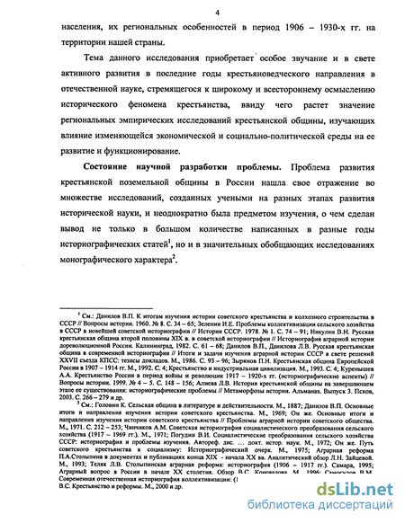 Состояние научной разработки проблемы. Проблема развития крестьянской поземельной общины в России нашла свое отражение во множестве исследований, созданных учеными на разных этапах развития исторической науки, и неоднократно была предметом изучения, о чем сделан вывод не только в большом количестве написанных в разные годы историографических статей1, но и в значительных обобщающих исследованиях монографического характера .
