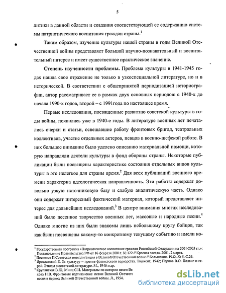 Первые исследования, посвященные развитию советской культуры в годы войны, появились уже в 1940-е годы. В литературе военных лет печатались очерки и статьи, освещавшие работу фронтовых бригад, театральных коллективов, участие отдельных актеров, певцов в военно-шефской работе. В них большое внимание было уделено описанию материальной помощи, которую направляли деятели культуры в фонд обороны страны. Некоторые публикации были посвящены характеристике состояния отдельных видов куль-туры в это нелегкое для страны время. Для всех публикаций военного времени характерна идеологическая направленность. Эти работы содержат довольно узкую источниковую базу и слабую аналитическую часть. Однако они содержат интересный фактический материал, который представляет интерес для дальнейших исследований. В центре внимания многих исследова-ний было песенное творчество военных лет, массовые и народные песни. Однако многие из них были знакомы лишь небольшому кругу бойцов, так как были посвящены какому-то конкретному текущему событию и имели ко роткую жизнь. В это время были написаны и некоторые музыковедческие и этнографические исследования, посвященные фольклору.1 На наш взгляд, трудно давать оценку этому виду народного творчества периода 1941-1945 годов, так как он в указанный период нуждается в дальнейшем изучении и анализе.