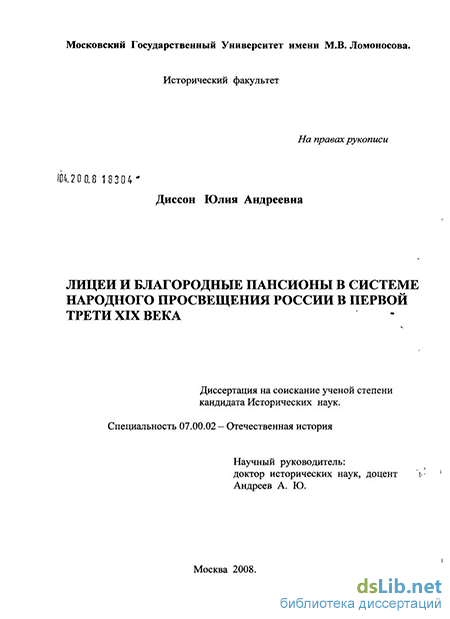 В последние годы появилось значительное число работ, посвященных изучению истории университетов. Здесь нужно выделить работу Ф.А. Петрова «Формирование системы университетского образования в России» . Автор рассматривает всю систему высшего образования России, в том числе и учебные заведения, которые представляли альтернативу университетскому образованию. Он отмечает, что в наиболее благоприятный период своей истории, после получения особых прав и привилегий, пансионы и подобные привилегированные учебные заведения представляли угрозу