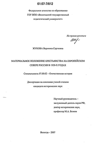 защищен ряд диссертаций о материальном положении крестьянства, в том числе и Европейского Севера первых десятилетий XX века