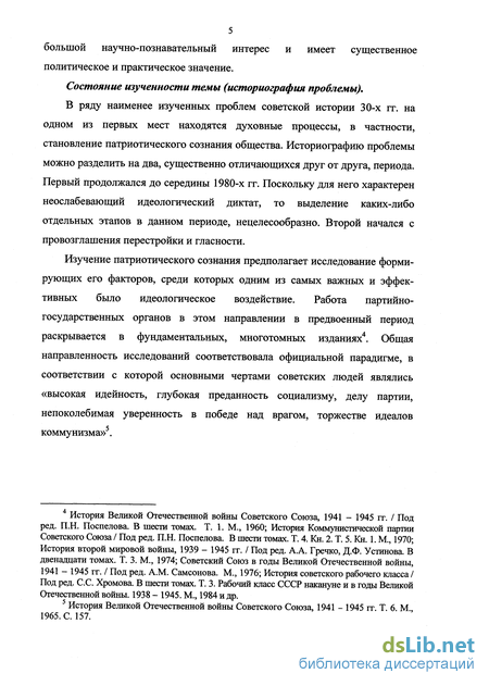 Таким образом, историографический анализ позволил сформулировать следующий вывод. Несмотря на то, что на протяжении десятилетий историческая наука находилась в жестких идеологических рамках, исследователями проблемы была проделана значительная работа, накоплен солидный материал, раскрыты отдельные сюжеты, что облегчает задачи комплексного исследования. Изменение политической ситуации в стране, начавшееся в середине 1980-х гг., оказало благотворное влияние на состояние исторической науки, стали разрабатываться новые темы, меняться методологические подходы. Открытие архивов предоставило возможность дать правдивую картину советской истории. Однако анализ литературы свидетельствует о том, что патриотическое сознание народа в 1930-е гг. подвергалось изучению с исторической точки зрения в качестве сопутствующих, подчиненных сюжетов. Несмотря на обилие публикаций, комплексных работ, всесторонне рассматривающих процесс формирования патриотических компонентов массового сознания советского народа в