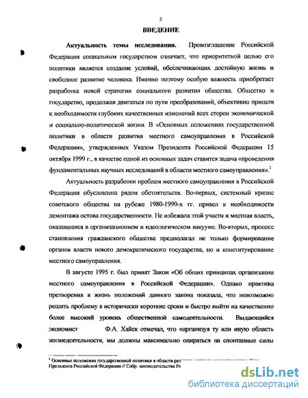 Актуальность темы исследования. Провозглашение Российской Федерации социальным государством означает, что приоритетной целью его политики является создание условий, обеспечивающих достойную жизнь и свободное развитие человека. Именно поэтому особую важность приобретает разработка новой стратегии социального развития общества. Общество и государство, продолжая двигаться по пути преобразований, объективно пришли к необходимости глубоких качественных изменений всех сторон экономической и социально-политической жизни. В «Основных положениях государственной политики в области развития местного самоуправления в Российской Федерации», утвержденных Указом Президента Российской Федерации 15 октября 1999 г., в качестве одной из основных задач ставится задача «проведения фундаментальных научных исследований в области местного самоуправления».1