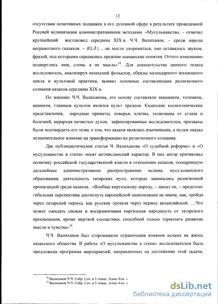 Реализацию политики русификации в Казахстане во второй половине XIX в. вызвала необходимость обоснования тезиса о слабом влиянии ислама на жизнь казахского социума, отсутствии позитивных подвижек в его духовной сфере в результате проведенной Россией исламизации административными методами. «Мусульманство, - отмечал крупнейший востоковед середины XIX в. Ч.Ч. Ва- лиханов, - среди народа неграмотного (казахов. - Ю.Л.) .. .не могло укорениться, оно оставалось звуком, фразой, под которыми скрывались прежние шаманские понятия. Оттого изменению подверглись имя, слова, а не мысль».