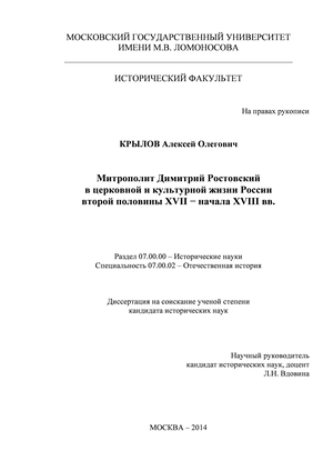 Крылов Алексей Олегович. Митрополит Димитрий Ростовский в церковной и культурной жизни России второй половины XVII начала XVIII вв.: диссертация ... кандидата исторических наук: 07.00.02 / Крылов Алексей Олегович;[Место защиты: Московский государственный университет имени М . В . Ломоносова].- Москва, 2014.- 377 с.