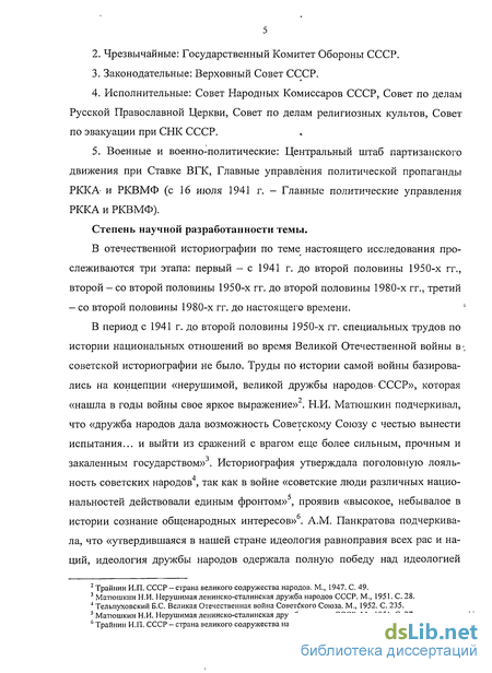 В период с 1941 г. до второй половины 1950-х гг. специальных трудов по истории национальных отношений во время Великой Отечественной войны в-, советской историографии не было. Труды по истории самой войны базировались на концепции «нерушимой, великой дружбы народов' СССР», которая «нашла в годы войны свое яркое выражение»". Н.И. Матюшкин подчеркивал, что «дружба народов дала возможность Советскому Союзу с честью вынести испытания... и выйти из сражений с врагом еще более сильным, прочным и закаленным государством» . Историография утверждала поголовную лояльность советских народов, так как в войне «советские люди различных национальностей действовали единым фронтом», проявив «высокое, небывалое в истории сознание общенародных интересов». A.M. Панкратова подчеркивала, что «утвердившаяся в нашей стране идеология равноправия всех рас и наций, идеология дружбы народов одержала полную победу над идеологией звериного национализма фашистов» . Оценивая итоги войны, И.П. Трайнин утверждал, что «испытание силы и прочности дружбы народов СССР», которым являлась война, было «выдержано Советским Союзом с честью». По мнению Б.В. Тельпуховского, «народы СССР еще теснее сплотились вокруг своего старшего брата — великого русского 'народа, как руководящей силы страны». Несмотря на, в целом, верную проработку аспекта дружбы народов, советская историография данного периода не изучала такие проблемы как депортации народов, коллаборационизм, националистическое повстанческое движение, антисемитизм и др., что объясняется политической конъюнктурой того периода.