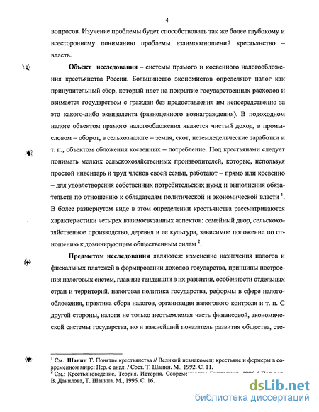 Объект исследования - системы прямого и косвенного налогообложения крестьянства России. Большинство экономистов определяют налог как принудительный сбор, который идет на покрытие государственных расходов и взимается государством с граждан без предоставления им непосредственно за это какого-либо эквивалента (равноценного вознаграждения). В подоходном налоге объектом прямого налогообложения является чистый доход, в промысловом - оборот, в сельхозналоге - земля, скот, неземледельческие заработки и т. п., объектом обложения косвенных - потребление. Под крестьянами следует понимать мелких сельскохозяйственных производителей, которые, используя простой инвентарь и труд членов своей семьи, работают - прямо или косвенно - для удовлетворения собственных потребительских нужд и выполнения обязательств по отношению к обладателям политической и экономической власти '. В более развернутом виде в этом определении крестьянства рассматриваются характеристики четырех взаимосвязанных аспектов: семейный двор, сельскохозяйственное производство, деревня и ее культура, зависимое положение по от-ношению к доминирующим общественным силам .