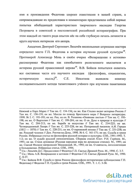 Академик Дмитрий Сергеевич Лихачёв несколькими штрихами мастера определил место Г.П. Федотова в истории изучения русской культуры18. Протоиерей Александр Мень в своём очерке «Возвращение к истокам» рассматривал Федотова как самобытного религиозного мыслителя и историка русской православной церкви19. В.В. Бойков попытался охватить все составные части его научного наследия (философию, социологию, историческую мысль) . СЕ. Никитина выявляла новизну исследовательского метода талантливого учёного при изучении памятников