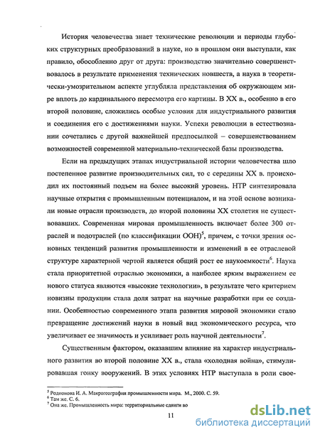 Существенным фактором, оказавшим влияние на характер индустриального развития во второй половине XX в., стала «холодная война», стимулировавшая гонку вооружений. В этих условиях НТР выступала в роли свое 5 Родионова И. А. Макрогеография промышленности 7 Она же. Промышленность мира: территориальные сдвиги во второй половине XX века. M., 2003. С.73. образного «локомотива», постоянно наращивавшего темп усовершенствования изобретений и технических разработок. В такой трактовке НТР следует воспринимать как глобальное явление, возникшее одновременно и параллельно в основном в двух центрах научно-технической мысли — СССР и США. Формы ее инициации и реализации были различны: если в нашей стране ВПК был под полным контролем государства в связи со сложившимися историческими условиями, то в США сложилась модель заказа государства и реализации частными компаниями. Обе модели оказались достаточно эффективными, что и предопределило конечный продукт — паритет двух супердержав.