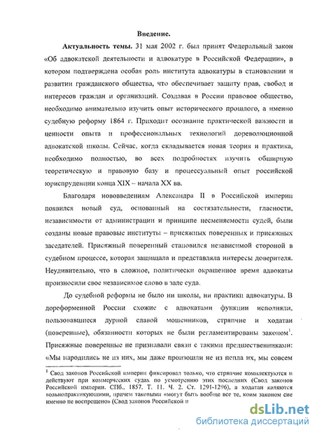 Актуальность темы исследования. 31 мая 2002 г. был принят Федеральный закон «Об адвокатской деятельности и адвокатуре в Российской Федерации», в котором подтверждена особая роль института адвокатуры в становлении и развитии гражданского общества, что обеспечивает защиту прав, свобод и интересов граждан и организаций. Создавая в России правовое общество, необходимо внимательно изучить опыт исторического прошлого, а именно судебную реформу 1864 г. Сейчас, когда складывается новая теория и практика, необходимо полностью, во всех подробностях изучить обширную теоретическую и правовую базу российской юриспруденции конца XIX – начала XX вв., в том числе опыт и профессиональные технологии дореволюционной адвокатской школы.