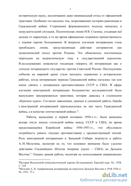 Работы, вышедшие в первой половине 1950-х гг., были написаны вскоре после начала «холодной войны между СССР и США, что обусловило потребность увязать текущее противостояние с предшествующей эпохой. Роль иностранной интервенции в Западной Сибири затронута в работах А. И. Мельчина и А. В. Берёзкина 6. Но эти исследования, несмотря на использование в них американской периодики, преувеличивали роль США в интервенции, не уделяя должного внимания взаимодействию американцев с остальными союзниками.