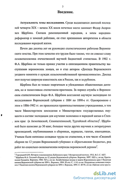 Почти два десятка лет он руководил статистическими работами Воронежского земства За период службы в Воронежском статистическом бюро Ф А Щербина возглавлял научную экспедицию по исследованию Воронежской губернии с 1884 по 1890-е гг Одновременно с этим в 1886-1902 гг он привлекался правительственными учреждениями, в том числе Министерством земледелия и Министерством государственных имуществ, в составе экспедиции для изучения экономики и народной жизни в Степном крае (в Акмолинской, Семипалатинской, Тургайской областях)1 Ученым были написаны солидные труды по статистике и ряд работ по социально-экономическим вопросам воронежской деревни" При этом качество ею трудов было таково, что он снискал славу основоположника отечественной научной бюджетной статистики