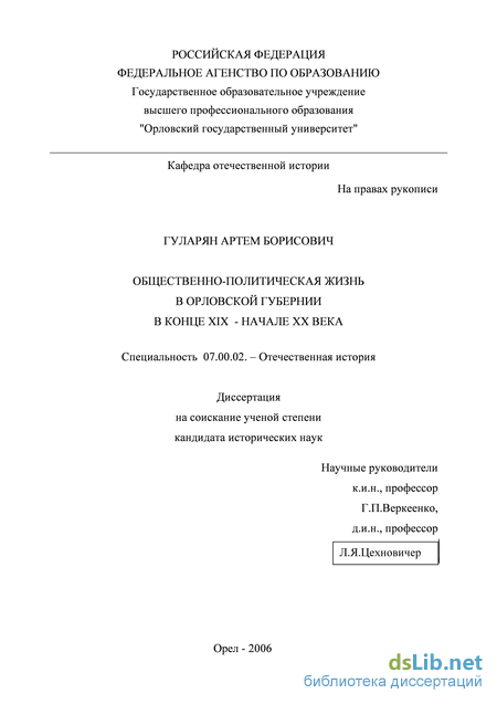 губернии. Автореф. дисс... канд. ист. наук. Орел, 2005.