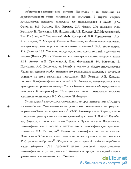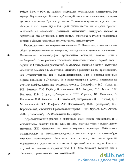 Достаточно широко изучалось в последние годы художественное творчество и литературная критика русского мыслителя ; исследовались и некоторые аспекты его биографии8. Особое развитие в современной отечественной науке получила тема «Леонтьев и Ф.М. Достоевский» и нередко связанная с ней тема «Леонтьев и B.C. Соловьев»7 .