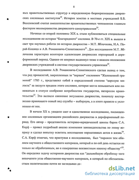 В начале XX в. увидело свет и единственное исследование, посвященное сословным организациям российского дворянства в дореформенный период. Его автор - представитель историко-юридической школы барон С.А. Корф - провел подробный анализ изменения законодательства по этому вопросу и сделал попытку осветить воплощение нормативных актов в жизнь24. С.А. Корф отмечал, что приступая к исследованию, был "поражен тем обилием научного и общественного материала, который и по сей день остается не только не обработанным, но и совершенно неизвестным нашему обществу" . Он определял задачу историков дворянства как "дальнейшую обработку того непочатого угла общественно-научного материала, в который по обстоятельствам политическим почти не заглядывал до настоящего времени глаз учено-