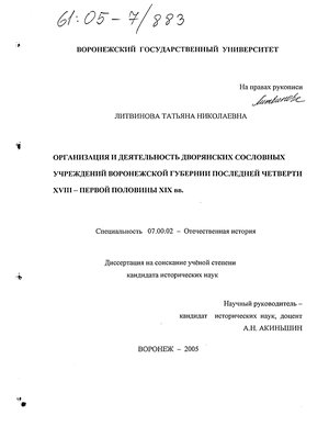 В качестве объекта в данном диссертационном исследовании избраны дворянские корпоративные учреждения Воронежской губернии последней четверти XVIII - первой половины XIX вв., являвшиеся неотъемлемой частью системы местного управления и сословного самоуправления.
