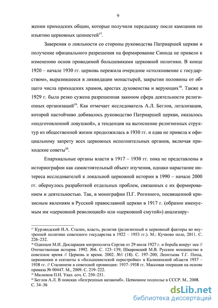 Из обширного массива работ, посвященных истории Русской православной церкви и государственно-церковных отношений в первые десятилетия после установления советской власти, для настоящего исследования первостепенный интерес представляют монографии и статьи, раскрывающие социально-политический контекст формирования и функционирования церков-но-административных структур. Они стали появляться уже в 1920 гг., причем авторами ранних работ нередко были очевидцы или участники событий. Несмотря на изобилие трудов, их проблематика отличалась однообразием практически на всем протяжении советского периода. В подобных исследованиях, часто представляющих собой образцы исторической публицистики, Русская православная церковь рассматривалась как реакционная и контрреволюционная сила, вынужденно вставшая на путь примирения с советской властью. При этом авторы уделяли основное внимание деятельности высших органов церковной власти, оставляя за рамками исследований церковно-администра-тивные структуры епархиального уровня1.