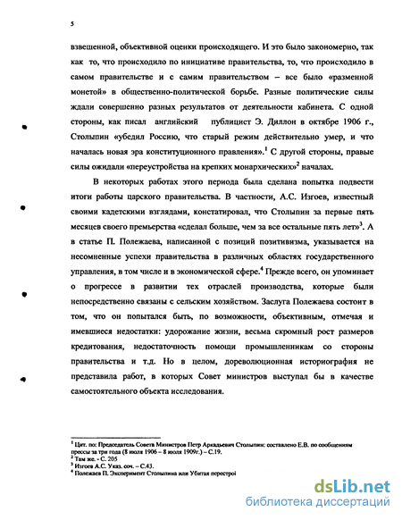 В некоторых работах этого периода была сделана попытка подвести итоги работы царского правительства. В частности, А.С. Изгоев, известный своими кадетскими взглядами, констатировал, что Столыпин за первые пять месяцев своего премьерства «сделал больше, чем за все остальные пять лет»3. А в статье П. Полежаева, написанной с позиций позитивизма, указывается на несомненные успехи правительства в различных областях государственного управления, в том числе и в экономической сфере.4 Прежде всего, он упоминает о прогрессе в развитии тех отраслей производства, которые были непосредственно связаны с сельским хозяйством. Заслуга Полежаева состоит в том, что он попытался быть, по возможности, объективным, отмечая и имевшиеся недостатки: удорожание жизни, весьма скромный рост размеров кредитования, недостаточность помощи промышленникам со стороны правительства и т.д. Но в целом, дореволюционная историография не представила работ, в которых Совет министров выступал бы в качестве самостоятельного объекта исследования.