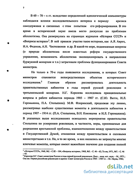 В 60 - 70 - х гг. вследствие определенной идеологической конъюнктуры наблюдался всплеск исследовательского интереса к периоду кризиса самодержавия и связанных с этим попыткам его реформирования. В это время в исторической науке имела место дискуссия по проблемам абсолютизма. Она развернулась на страницах журналов «История СССР» и «Вопросы истории»1. В ней приняли участие такие историки, как А.Я. Аврех, И.А. Федосов, А.Н. Чистозвонов и др. В какой-то мере, поднимаемые вопросы (о природе абсолютизма после известных реформ государственного управления, возможность абсолютизма эволюционировать в направлении буржуазной монархии и т.п.) затрагивали проблемы функционирования Совета министров.