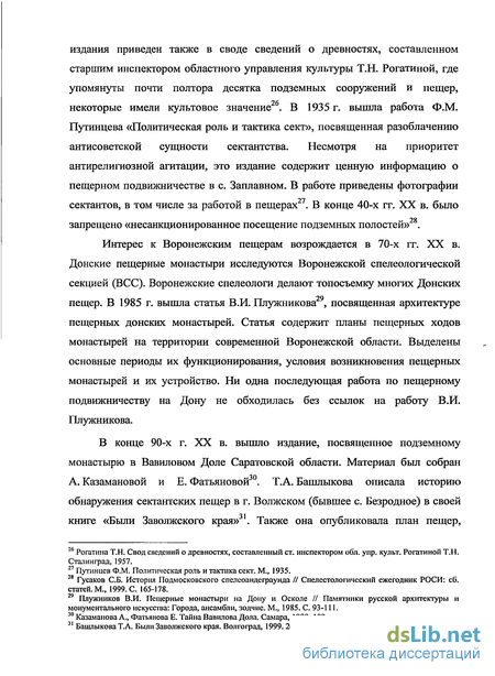 В конце 90-х г. XX в. вышло издание, посвященное подземному монастырю в Вавиловом Доле Саратовской области. Материал был собран А. Казамановой и Е. Фатьяновой30. Т.А. Башлыкова описала историю обнаружения сектантских пещер в г. Волжском (бывшее с. Безродное) в своей книге «Были Заволжского края» . Также она опубликовала план пещер,
