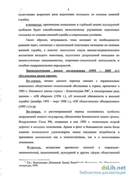 Во-первых, начало данного периода связано с кардинальным изменением общественно-политической обстановки в стране, принятием в 1993 г Основного закона страны - Конституции РФ1, в последующем ряда законов - «Об обороне» (1996 г), «О воинской обязанности и военной службе» (декабрь 1993 - март 1998 г), «Об общественных объединениях» (1995 г) идр