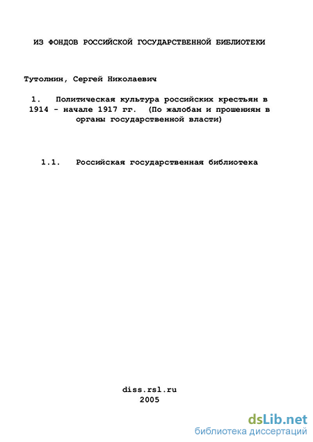 Тутолмин Сергей Николаевич. Политическая культура российских крестьян в 1914 - начале 1917 гг. : По жалобам и прошениям в органы государственной власти : диссертация ... кандидата исторических наук : 07.00.02.- Санкт-Петербург, 2003.- 224 с.: ил. РГБ ОД, 61 03-7/826-0