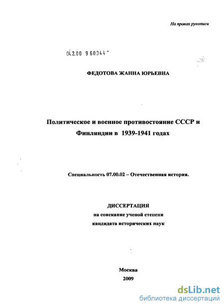 Предметом исследования автором были избраны основные направления внешней политики и военных действий Советского Союза в войне против Финляндии в процессе ее начала и развития как составной части мировой военной трагедии. Этим же определяются и хронологические рамки диссертационного исследования, в которых концентрируется внимание на наиболее насыщенных для советской внешней деятельности в советско-финских политических и военных противостояний. Именно в это время полным ходом отрабатываются военные доктрины, усиленно милитаризуются все стороны жизни Финляндии, как потенциального союзника фашистской Германии. Именно этот период в истории Второй мировой, и в частности, советско-финской войны изобилует всевозможными документами с грифом «Секретно» и «Совершенно секретно», которые в последние годы стали достоянием гласности и, естественно, споров.