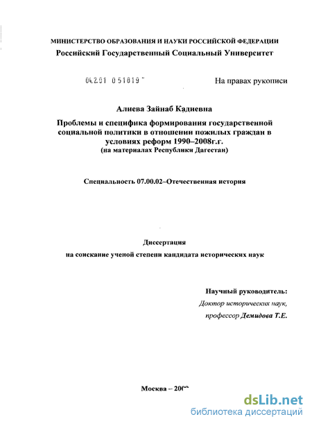 Республика Дагестан - самая крупная из всех республик Северного Кавказа. Исследование деятельности властных и общественных структур государства по социальной политике в отношении людей пожилого возраста представляет теоретический и практический интерес. Сравнение опыта Республики Дагестан с деятельностью других регионов Российской Федерации позволит иметь более обоснованное представление об уровне социальной политики, проводимой в целом в Российской Федерации в период с 1990 г. по 2008 г.