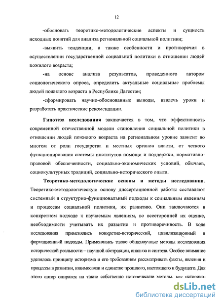 Гипотеза исследования заключается в том, что эффективность современной отечественной модели становления социальной политики в отношении людей пожилого возраста на региональном уровне зависит во многом от роли государства и местных органов власти, от четкого функционирования системы институтов помощи и поддержки, нормативно-правовой обеспеченности, социально-экономических условий, обычаев, социокультурных традиций, социально-исторического опыта.