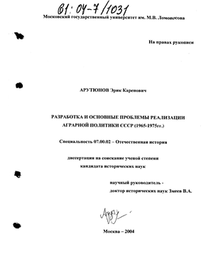 Целью исследования определено изучение особенностей разработки и основных проблем реализации советской аграрной политики, тенденций и противоречий аграрного развития СССР в 1965-1975гг.