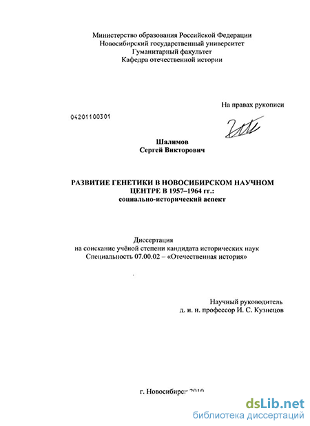 грань диссертации определяется временем создания Сибирского отделения, позволившего осуществить в его структуре институциональное возрождение «опальных» генетических исследований. Выделение конечной грани мотивируется завершением «оттепели», выражением чего стало отстранение Н. С. Хрущева от власти в октябре 1964 г., которое привело к кардинальному изменению общественно-политического контекста развития генетики.