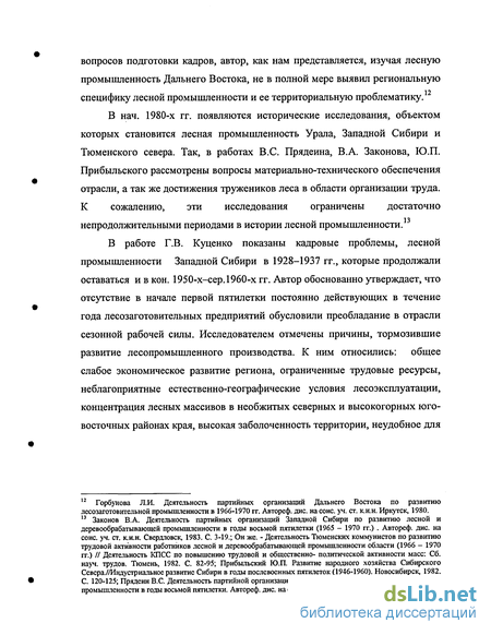 Горбунова Л.И. Деятельность партийных организаций Дальнего Востока по развитию лесозаготовительной промышленности в 1966-1970 гг. Автореф. дис. на соис. уч. ст. ки.н. Иркутск, 1980. 13 Законов В.А. Деятельность партийных организаций Западной Сибири по развитию лесной и деревообрабатывающей промышленности в годы восьмой пятилетки (1965 - 1970 гг.) . Автореф. дис. на соис. уч. ст. К.И.Н. Свердловск, 1983. С. 3-19.; Он же. - Деятельность Тюменских коммунистов по развитию трудовой активности работников лесной и деревообрабатывающей промьшіленности области (1966 - 1970 гг.) // Деятельность КПСС по повышению трудовой и общественно- политической активности масс: Сб. науч. трудов. Тюмень, 1982. С. 82-95; Прибыльский Ю.П. Развитие народного хозяйства Сибирского СевераУ/Индустриальное развитие Сибири в годы послевоенных пятилеток (1946-1960). Новосибирск, 1982. С. 120-125; Прядеин B.C. Деятельность партийной организации Урала по развитию лесоперерабатывающей промьшіленности в годы восьмой пятилетки. Автореф. дис. на соис. уч. ст. К.И.Н. Свердловск, 1981.