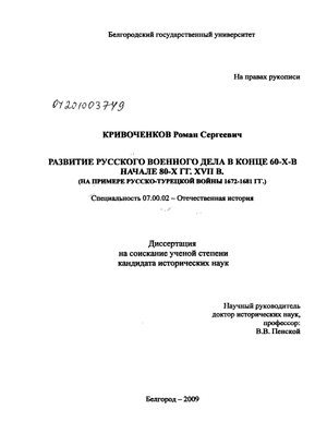 Целью диссертационного исследования является изучение развития русского военного дела в конце 1660-х - начале 1680-х гг. на примере русско-турецкой войны 1672-1681 гг.