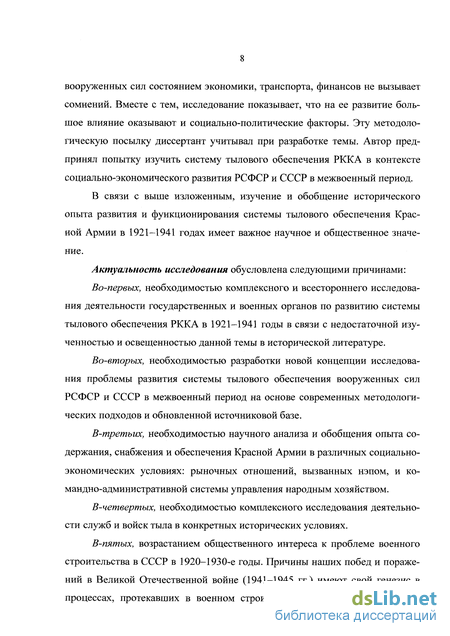 во-первых, необходимостью комплексного и всестороннего исследования деятельности государственных и военных органов по развитию системы тылового обеспечения РККА в 1921—1941 годы в связи с недостаточной изученностью и освещенностью данной темы в исторической литературе,