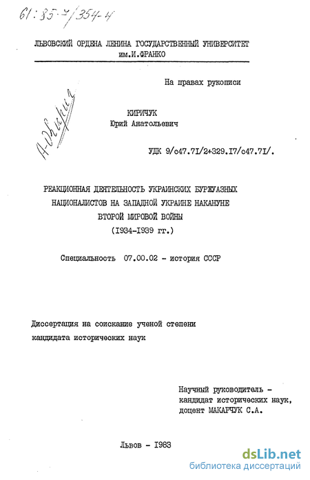 ма, характерна для работ М.Олексюка , Ю.Римаренко , В.Шевцова . Ряд важных положений о фашизации украинского буржуазно-националистического движения содержится в книге Р.Симоненко . Кроме этих, наиболее фундаментальных исследований, контрреволюционная деятельность украинских буржуазно-националистических партий на Западной Украине освещается также и в ряде других работ советских истори-