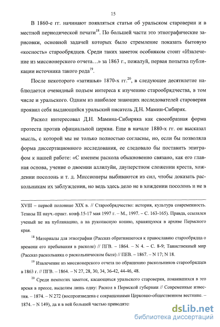 Из большого числа просмотренных нами диссертаций особо хотелось бы выделить три. Еще в 1983 г. В.И. Байдин подготовил и защитил диссертационное исследование по теме «Старообрядчество Урала и самодержавие. Конец XVIII - середина XIX вв.»31. Этот фундаментальный труд, на котором «выросло» уже не одно поколение исследователей староверия, до сих пор не утратил научной ценности, а основные его теоретические построения и выводы мы учитывали при написании своей работы.