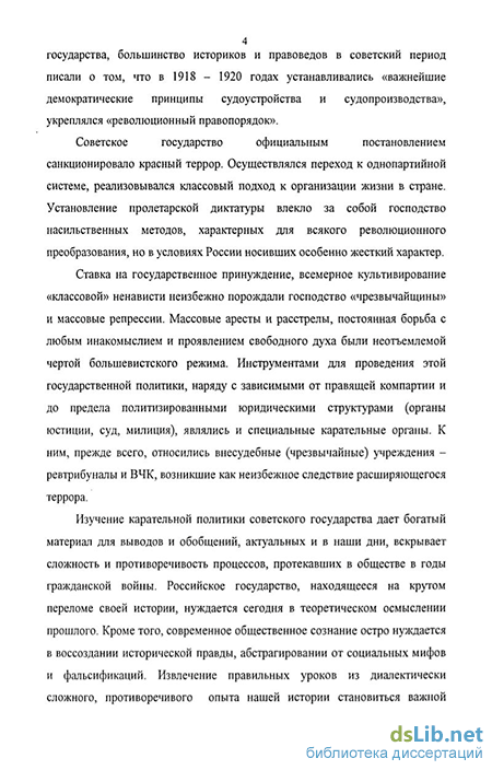 Методологическая основа исследования. В основу исследования положен принцип историзма, помогающий рассматривать становление чрезвычайных органов в причинно-следственной связи с процессами общественно-политической жизни советского государства в исследуемый период времени. Базовым методологическим принципом стала научная объективность, дающая возможность отойти от конъюнктурно-политических оценок событий, рассматривая их в реальном развитии, учитывая негативные аспекты для развития российского общества, связанные с формированием и развитием советской репрессивной системы. В процессе работы были использованы системный, ретроспективный, сравнительно-исторический и логический методы исследования. Комплексный характер диссертации предполагал анализ ряда проблем, находящихся на стыке отечественной истории с историей государства и права.