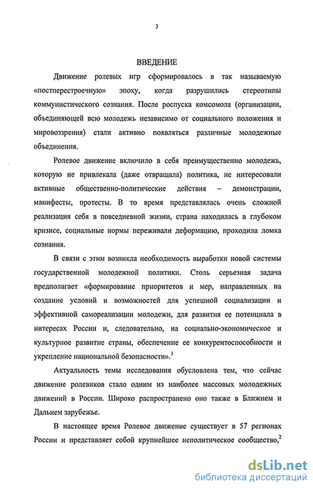 Актуальность темы исследования обусловлена тем, что движение ролевиков является одним из наиболее массовых молодежных движений в России Оно существует в 57 регионах страны и представляет собой крупнейшее неполитическое сообщество, насчитывающее по официальным оценкам более 20 тыс , а по неофициальным - свыше 50 тыс человек Поэтому необходимо в рамках общегосударственной концепции развивать то положительное, что накоплено ролевиками в плане воздействия на современную молодежь, использовать ролевые сообщества для воспитания у подрастающего поколения общечеловеческих ценностных установок и моральных принципов, для развития творческих устремлений молодых людей Все это должно базироваться на исследованиях как положительного, так и отрицательного исторического опыта ролевого движения