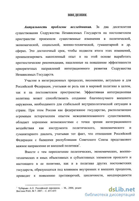 Хронологические рамки - 1991 - 2005 годы - выбраны не случайно. Они охватывают насыщенный историческими событиями период интеграционных отношений между Российской Федерацией и странами СНГ, которые в этот период формировались на совершенно новой основе. За 1991 - 2005 годы Российская Федерация и другие страны СНГ прошли сложный, и в некоторых отношениях противоречивый, путь от поиска модели межгосударственных интеграционных отношений до существенного расширения и углубления сотрудничества в сфере политики, экономики, безопасности, культурно-гуманитарных связей. Выбор таких хронологических рамок позволил проследить интеграционный процесс, осуществляемый в странах СНГ с учетом конкретно-исторических условий, где Российская Федерация играла приоритетную роль.