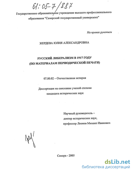 Обобщающих монографий по истории русского либерализма в 1917г. в современной исторической литературе нет. Попытки систематизировать накопленный материал до настоящего времени не шли далее очерковых работ, не создающих общей картины и упускающих ряд существенно важных моментов (специфику партийности, концептуальное и программное отличие консервативного и радикального либерализма, периодическую печать и т.д.), либо сборников статей по истории русского либерализма2. На страницах журналов и коллективных трудов не замол-